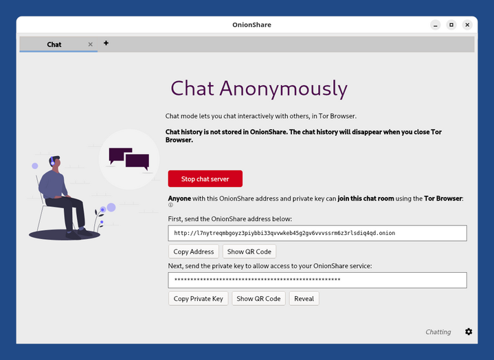 Les personnes avec l'adresse onion peuvent entrer dans ce salon de discussion depuis leur Navigateur Tor et discuter avec vous ou d'autres personnes.